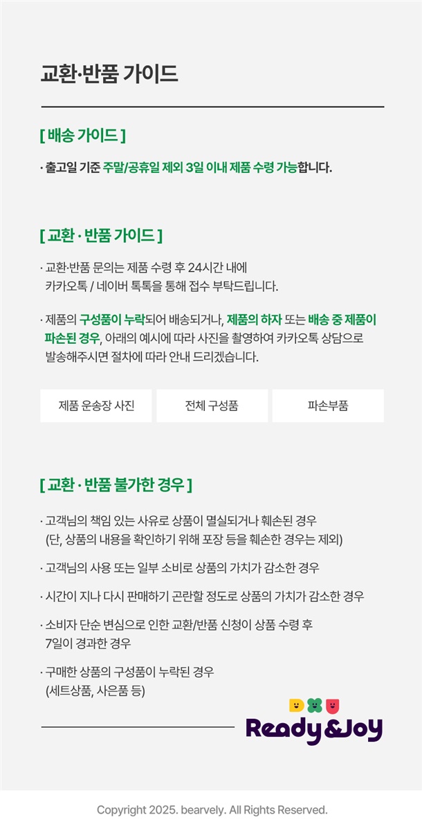 · 단순 변심 반품, 교환시 왕복배송료(6000원)가 박스당 부과됩니다.