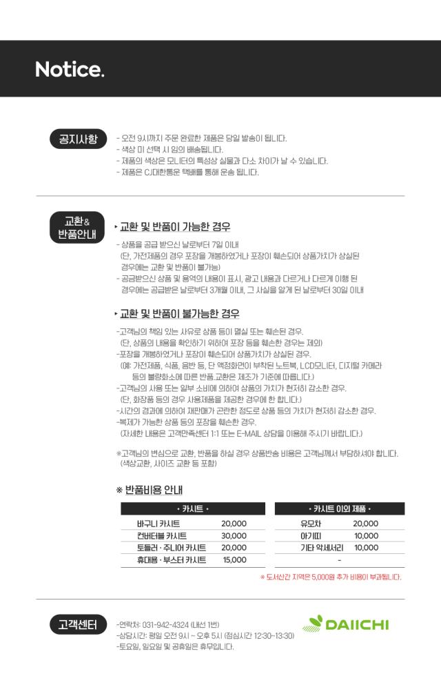 · ♣ 단순 변심 반품, 교환시 왕복배송료(15,000원)가 박스당 부과됩니다.