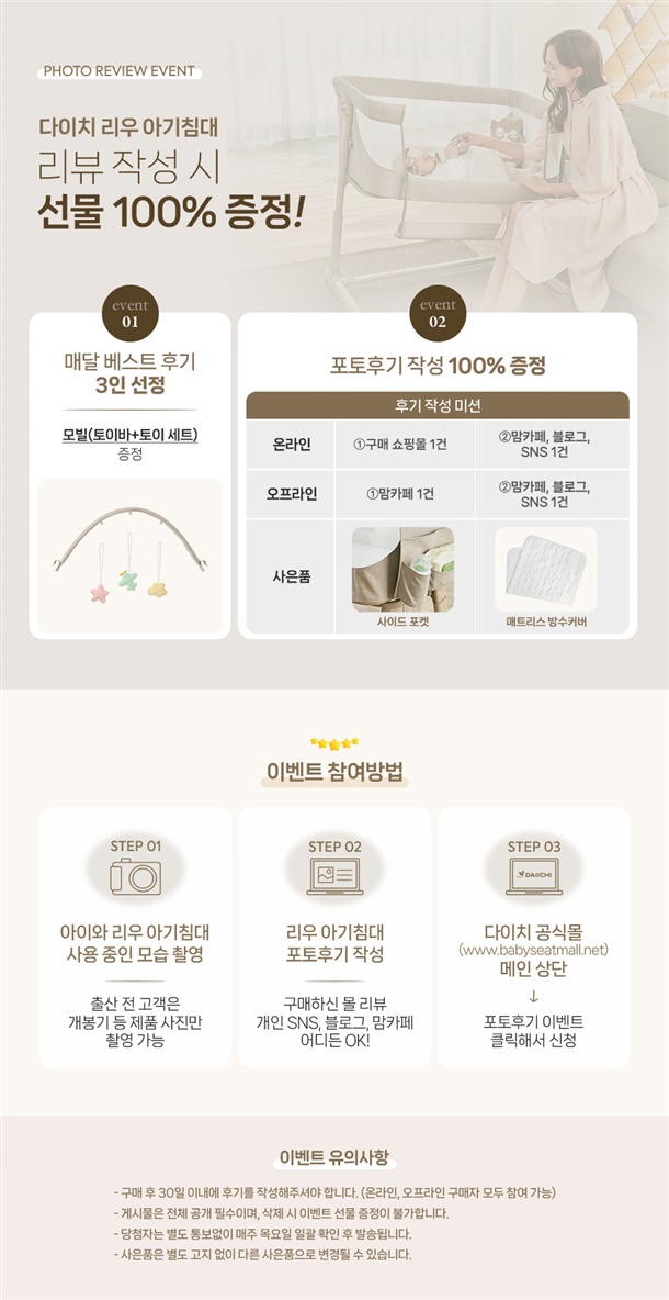 드디어 구매한 다이치 리우 아기침대😊 직접 구매해보니 왜 많은 분들이 추천하는지 알겠어요~~ 전체적으로 고급스러운 베이지톤에 깔끔한 디자인이 마음에 들어요 남편이 키가 194cm라 높이조절이 된다는 점이 너무 좋네요~ 지퍼로 탈부착이 가능한 사이드 오픈 기능 덕분에 침대에 붙여서 사용해도 좋을것 같아요ㅎㅎ 조립도 간편했고 전체적인 마감 퀄리티도 훌륭하네요 예비 부모님들께 진심으로 추천드리고 싶은 제품입니다! 이제 출산까지 2달정도 남았는데 잘 산것같아요!!ㅎㅎ