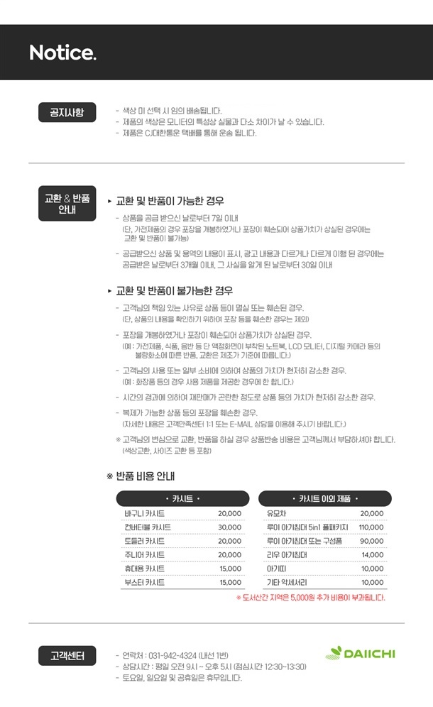 · ♣ 단순 변심 반품, 교환시 왕복배송료(15,000원)가 박스당 부과됩니다.