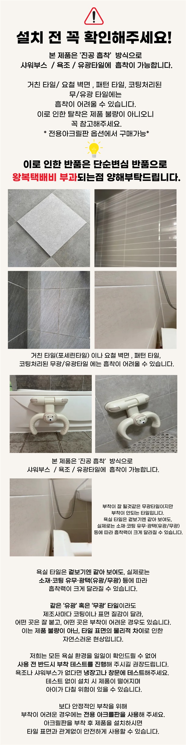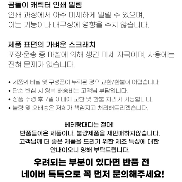 · 단순 변심으로 인한 반품, 교환 시 왕복배송료(6000원)가 부과됩니다.